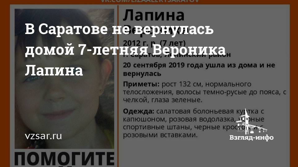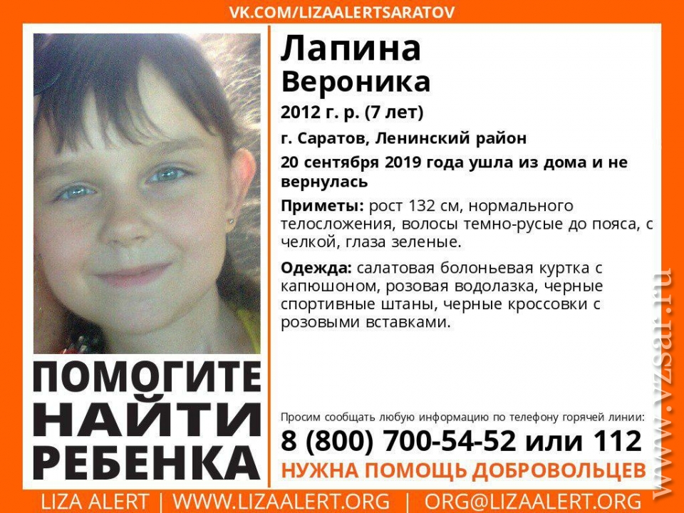 В Ленинском районе Саратова пропала без вести 7-летняя Вероника Лапина. О поисках ребенка сообщают волонтеры отряда "Лиза Алерт Саратов".