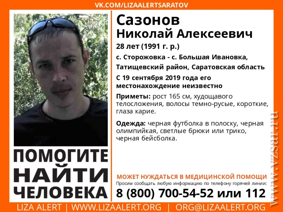 Всех, кому известно местонахождение Николая Сазонова, просят обращаться по телефону 8-800-700-54-52 или 112.