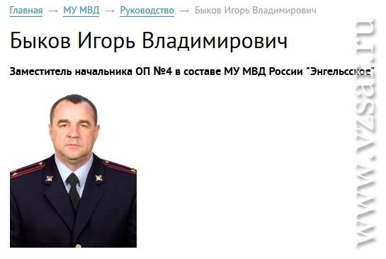 По данным ИА "Взгляд-инфо", речь идет о заместителе начальника ОП №4 в составе МУ МВД России "Энгельсское" Игоре Быкове, он имеет звание подполковника полиции.
