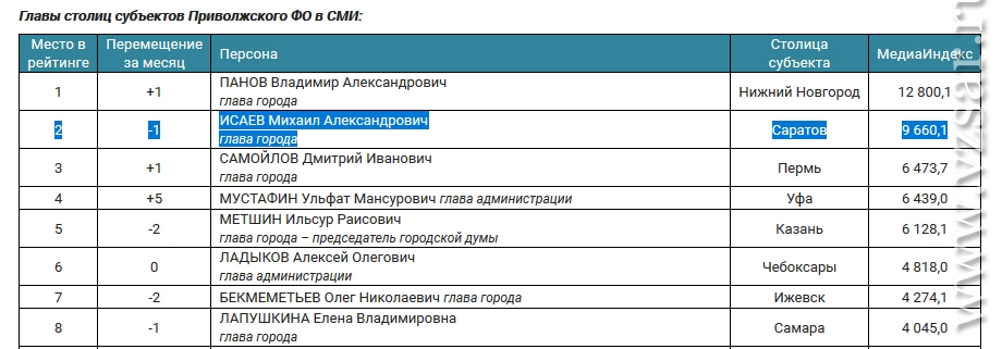 Глава Саратова Михаил Исаев потерял одну строку в медиарейтинге первых лиц столиц субъектов ПФО за сентябрь. Сегодня соответствующие данные обнародовала компания "Медиалогия".