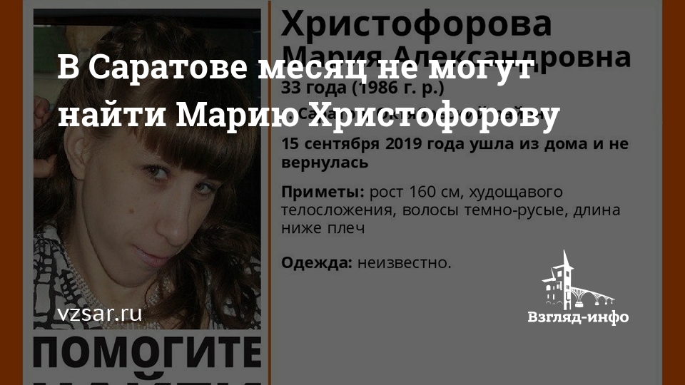 В Октябрьском районе Саратова без вести пропала 33-летняя Мария Христофорова. Об этом сообщает поисковый отряд "Лиза Алерт Саратов".