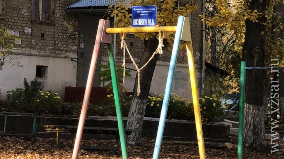 Судя по снимкам, качели появились во дворе благодаря Михаилу Исаеву в бытность его работы депутатом Госдумы, о чем свидетельствует специальная табличка.