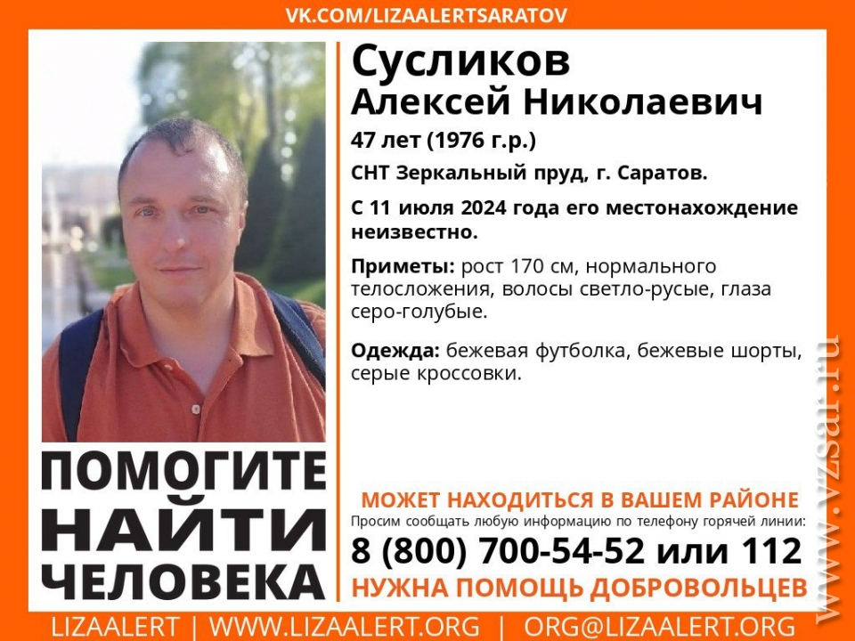 В Саратове неделю назад пропал 47-летний Алексей Сусликов, сообщает региональный поисковый отряд "Лиза Алерт Саратов".