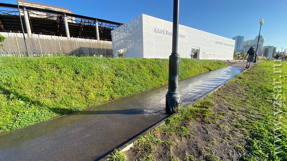 Сегодня утром гостей и участников Дня города на новой набережной Саратова встретили залитые водой асфальтовые дорожки.