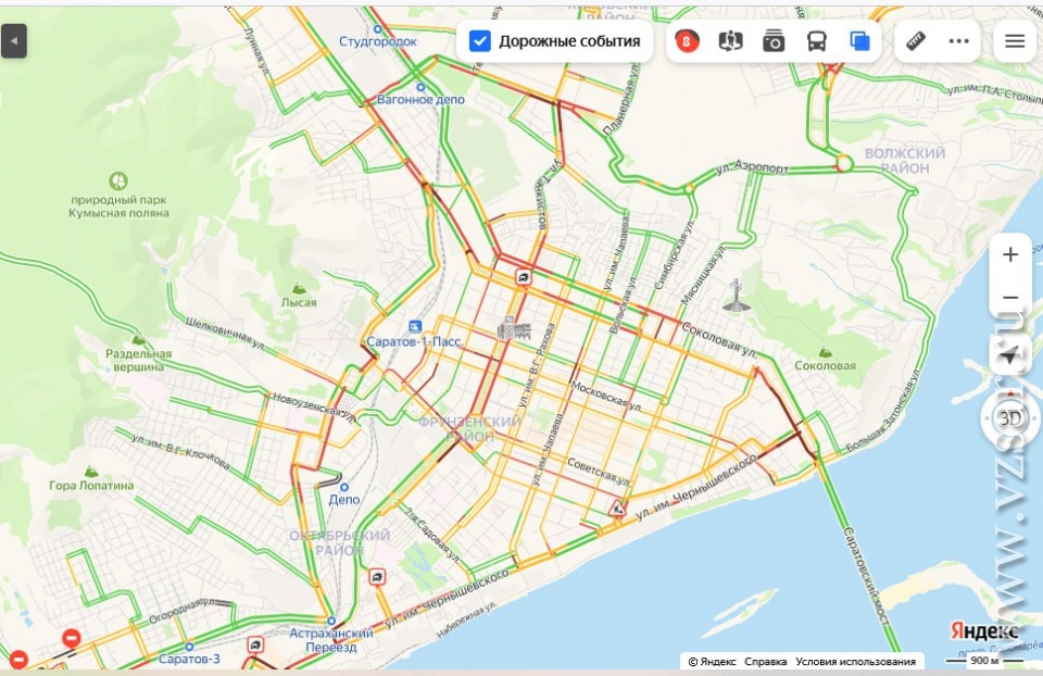 Сегодня жители Саратова добираются после работы через серьезные дорожные заторы. В эту минуту сервис "Яндекс.Пробки" оценивает ситуацию в городе на 8 баллов из 10.