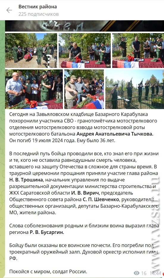 А Базарно-Карабулакская газета "Вестник района" сообщает, что сегодня на Завьяловском кладбище райцентра похоронили гранатометчика мотострелкового отделения Андрея Тычкова. Он погиб 19 июля; ему было 36 лет.