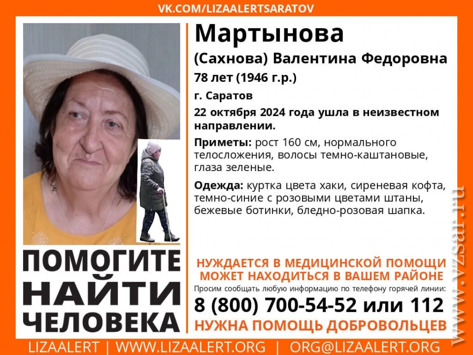 В Саратове без вести пропала 78-летняя Валентина Мартынова (Сахнова). Об этом сообщает поисковый отряд "Лиза Алерт Саратов".
