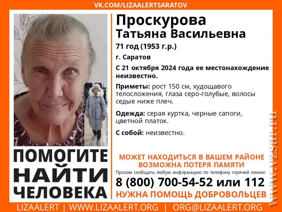 В Саратове ищут без вести пропавшую 71-летнюю Татьяну Проскурову. Об этом сообщает поисковый отряд "Лиза Алерт Саратов".