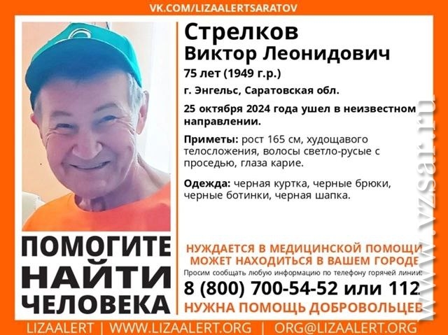 Вчера в Энгельсе пропал без вести 75-летний Виктор Стрелков, сообщает поисковый отряд "Лиза Алерт Саратов".