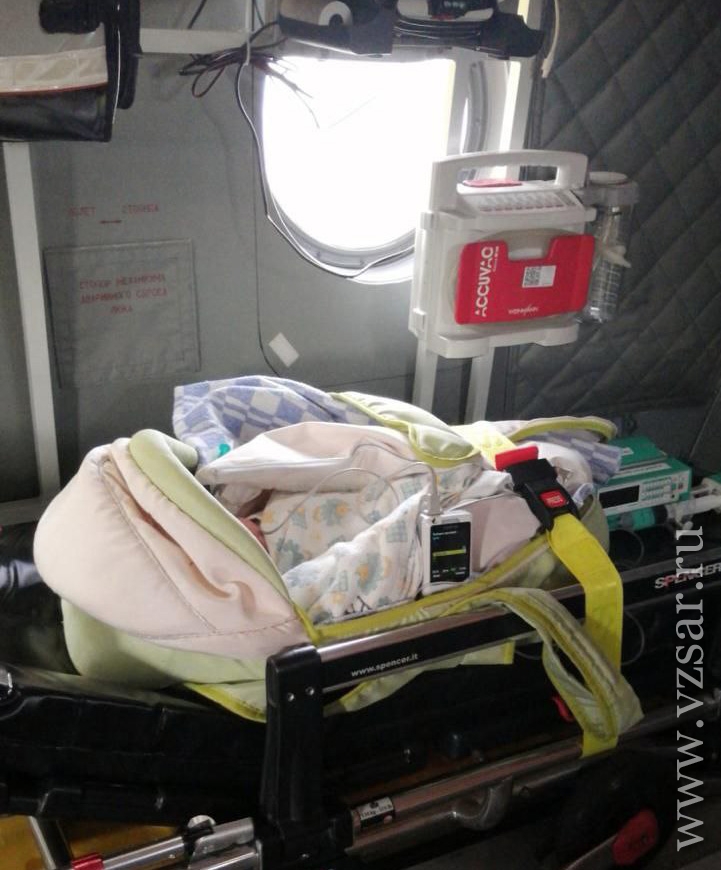 В сопровождении врача-реаниматолога и реанимационной медсестры вертолет привез двухдневного малыша с асфиксией (кислородное голодание организма) на аппарате искусственной вентиляции легких, рассказали в СОДКБ.