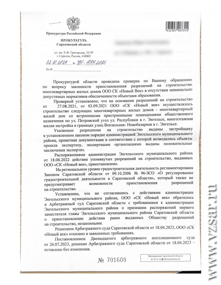 В конце октября этого года прокуратура Саратовской области после проверки обращения граждан, пришла к выводу, что попытки администрации Энгельсского района заблокировать инвестиционный проект компании "Новый век" идут в разрез с законодательством.
