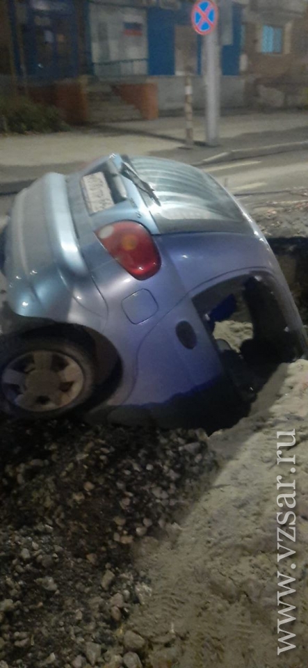Сегодня ночью в Волжском районе Саратова машина провалилась в дорожную яму.