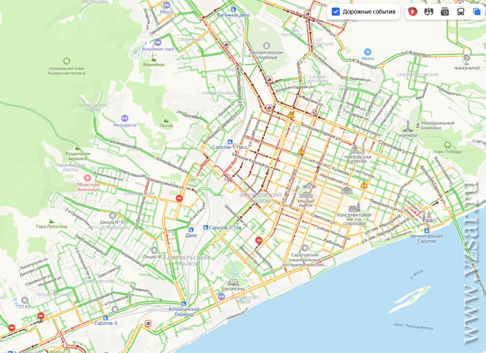 Сегодня жители Саратова проводят пятничный вечер в дорожных заторах. Сервис "Яндекс.Пробки" оценивает ситуацию в городе на 9 баллов из 10.