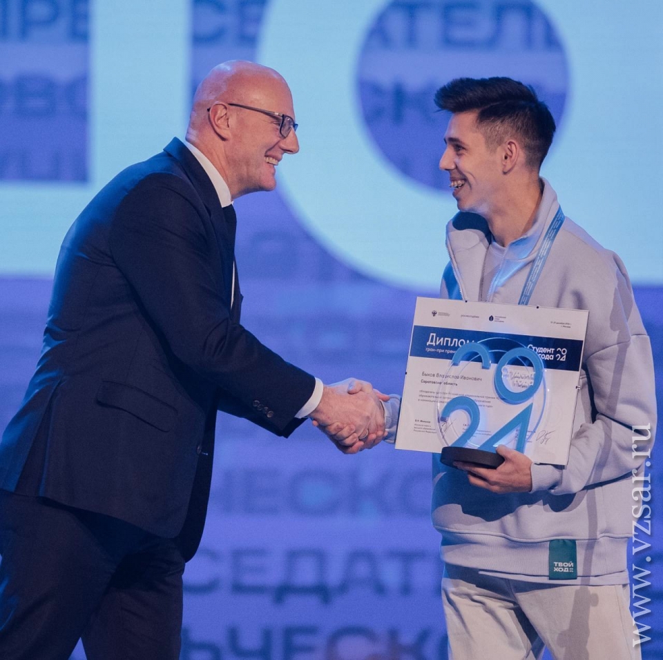 Обладателем Гран-при национальной премии "Студент года" стал председатель совета студентов и аспирантов СГУ Владислав Быков. Он принимал участие в номинации "Председатель совета обучающихся года" и вместе со званием лучшего студента выиграл денежную премию в размере 200 тыс. рублей.
