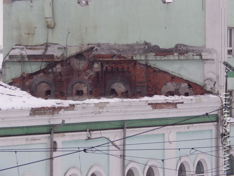 "В ходе сноса железнодорожного вокзала открываются ныне любопытнейшие вещи – фрагмент бокового фасада исторического здания вокзала 1871 года, еще до реконструкции по проекту Петра Митрофановича Зыбина в 1899–1900 годах. Собственно, он и находился под крышей одной из зыбинских пристроек.