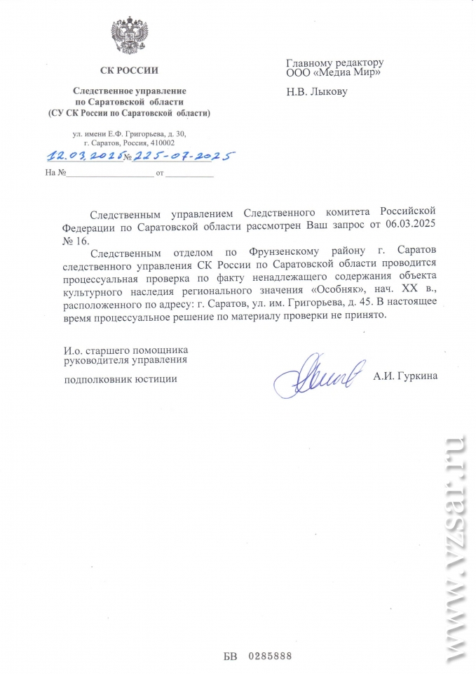 Следственное управление СК по Саратовской области проводит процессуальную проверку по факту ненадлежащего содержания объекта культурного наследия регионального значения - "Особняк Михаила Готовицкого, 1906 г.".