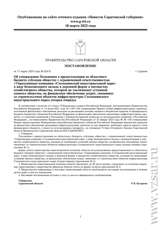 В соответствии с опубликованным вчера вечером документом ООО (учредитель - правительство Саратовской области) получает субсидию "на финансовое обеспечение затрат, связанных со строительством объектов инфраструктуры Столыпинского индустриального парка" (его второй очереди). Ее размер составляет 604 млн 153,3 тыс. рублей.