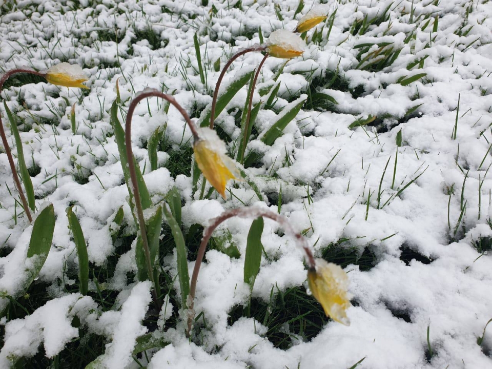 Чиновник опубликовал фотографии, на которых видны распустившиеся тюльпаны в снегу.