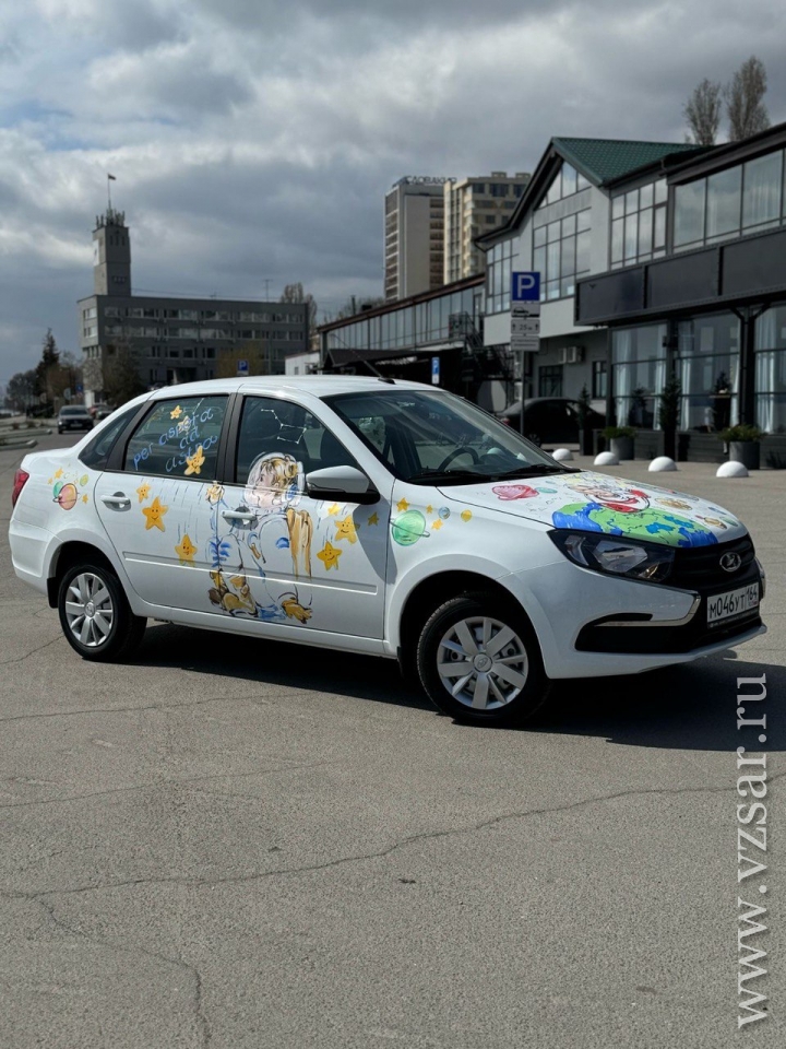 С помощью художницы Еленой Савчук они превратили автомобиль "Лада Гранта" в своеобразный "космомобиль" - борта машины украсили рисунками с космической тематикой.