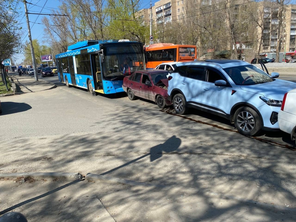 В 14.35 у поворота к монастырю (в районе остановки "Стрелка") троллейбус маршрута №5А въехал во впереди стоявший автомобиль "Дэу". В результате чего возник "эффект домино", который привел к повреждению еще четырех машин - двух "Рено", "Киа" и "Чери".