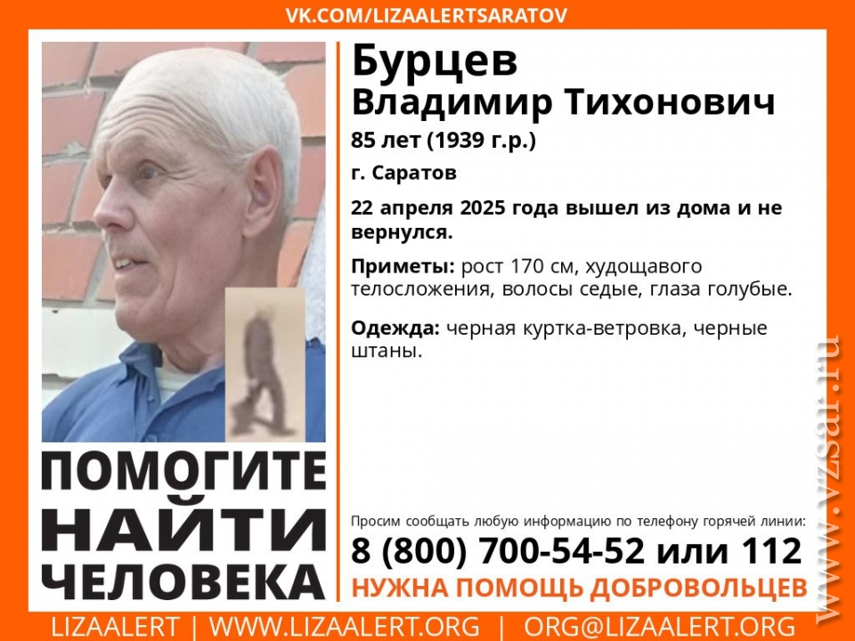 Так, 85-летний Владимир Бурцев ушел из дома вчера, и его местонахождение пока остается неизвестным.