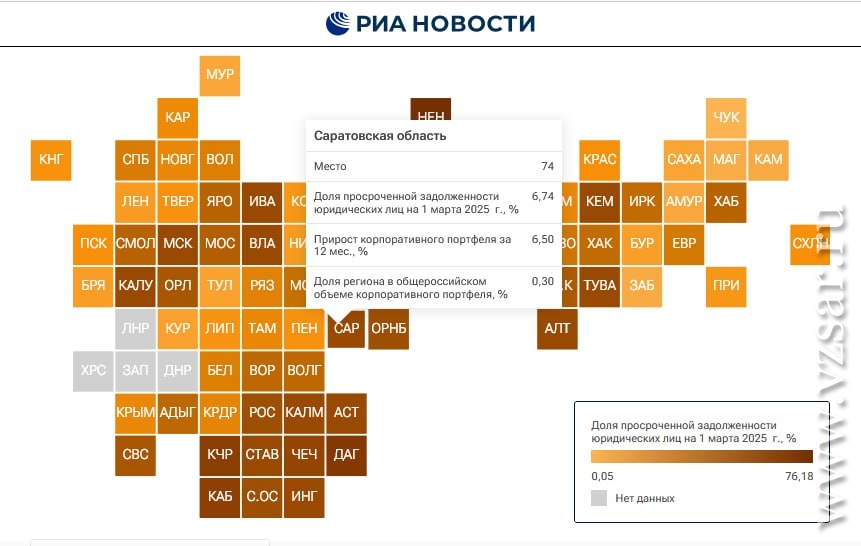Саратовская область в этом рейтинге занимает 74-е место из 85-ти. (год назад было 73-е место). Доля просрочки по кредитам у юрлиц здесь составляет 6,74%, при этом всего за год объем кредитования юрлиц вырос на 6,5%.