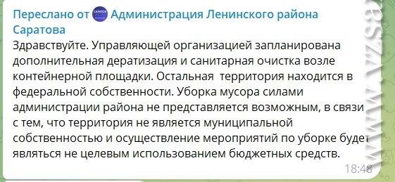 Обращались в администрацию - там заявили: что "территория находится в федеральной собственности", поэтому они ее убрать не могут - это, мол, будет являться нецелевым использованием бюджетных средств. Контейнерная площадка просто в ужасном состоянии - из-за постоянного переполнения баков и конструктивных особенностей, а также мусора вокруг там расплодились крысы. Они оккупировали и подвалы домов, в квартирах - тараканы. В райадминистрации обещали, что крыс потравит УК, но никаких подобных мероприятий мы не заметили.