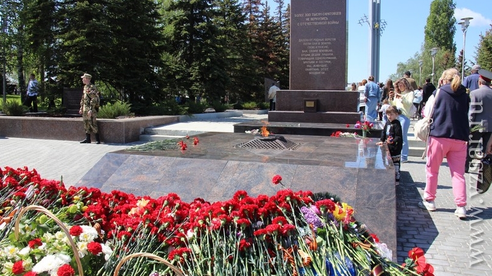 Сегодня десятки тысяч жителей Саратова пришли в парк Победы на Соколовой горе почтить память павших на полях Великой Отечественной войны.