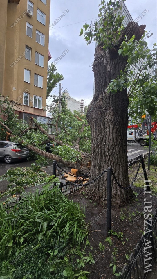 Судя по присланным очевидцами фото и видео, от сломавшегося дерева пострадали не менее двух иномарок.