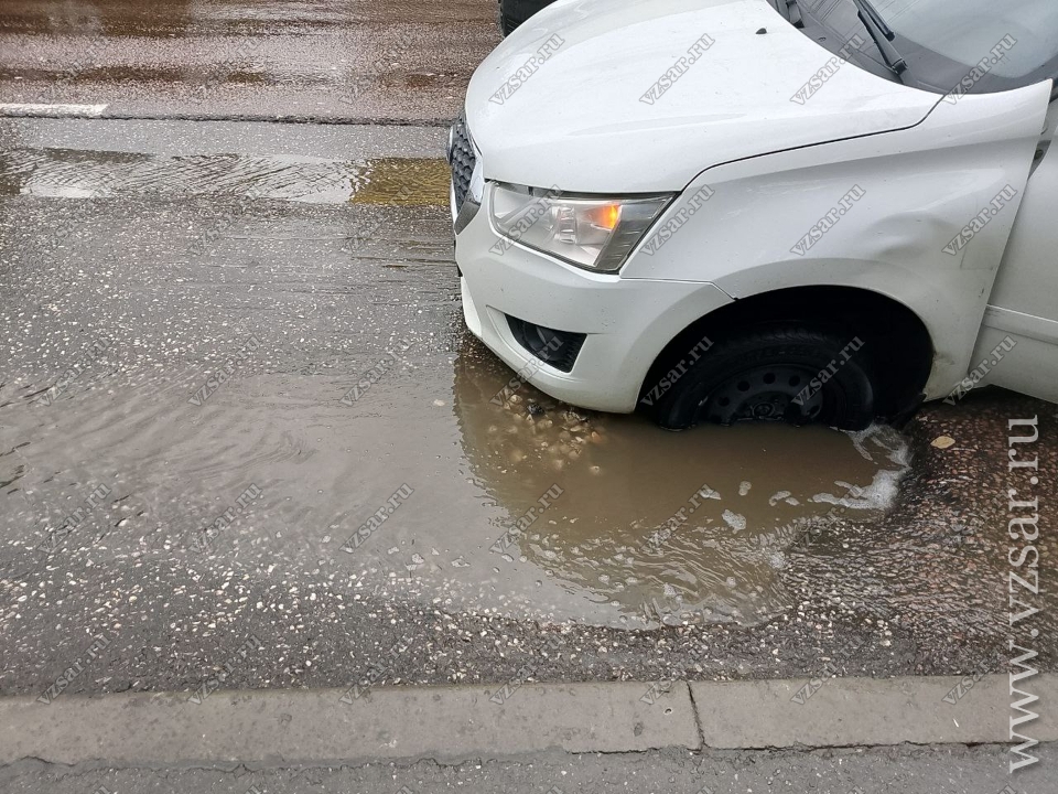 Предположительно, сотрудник службы такси на автомобиле "Датсун" не заметил провала в асфальте, скрытого лужей, и наехал на него левым передним колесом. В настоящий момент он ждет сотрудников ДПС, чтобы зафиксировать аварию.