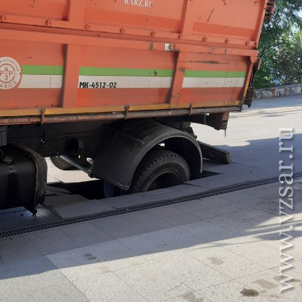Сегодня утром в Волжском районе Саратова мусоровоз провалился под плитку на старой набережной.