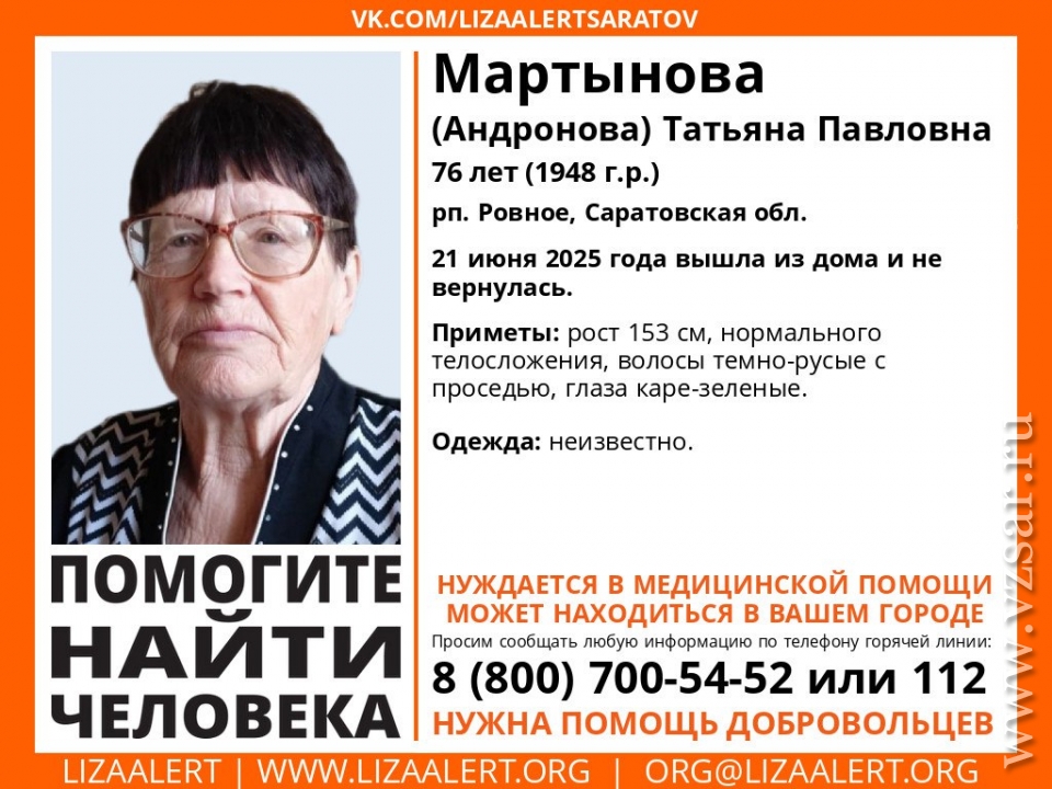 В Саратовской области без вести пропала 76-летняя Татьяна Мартынова (Андронова). Об этом сообщает поисковый отряд "Лиза Алерт Саратов".