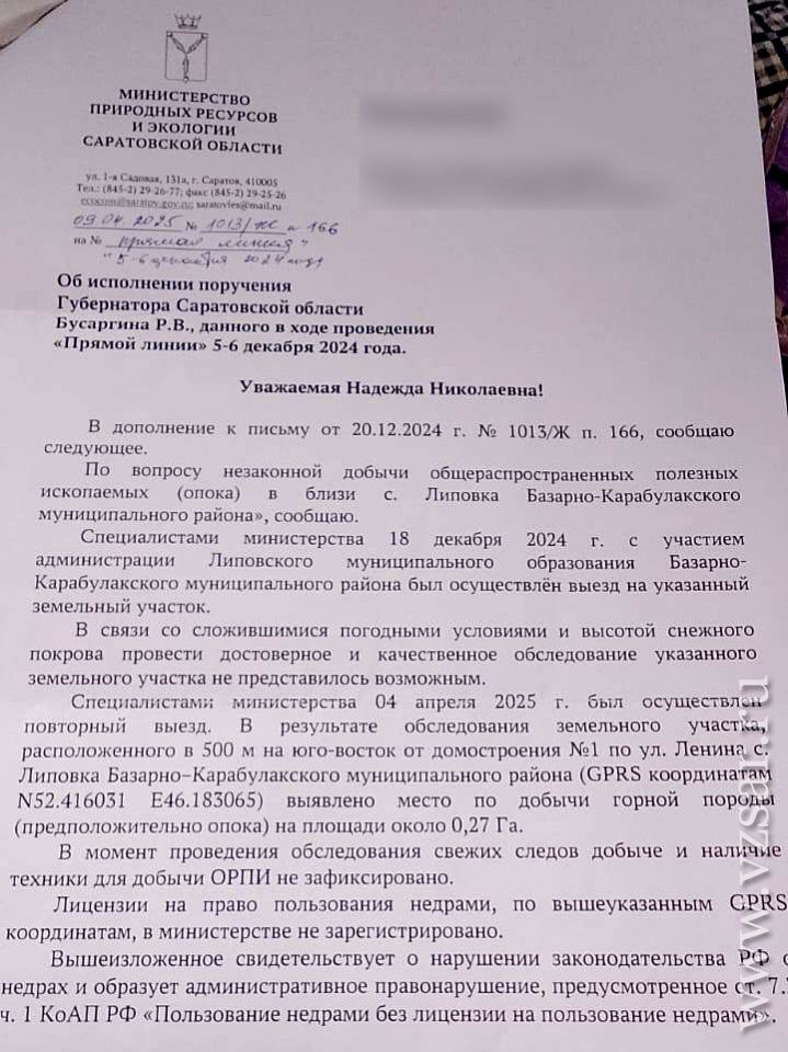 Напомним, недавно к председателю Следственного комитета РФ Александру Бастрыкину обратились жители села Липовка Энгельсского района Саратовско области, которые тоже обеспокоены незаконной разработкой карьера в их селе, а также уничтожением крупногабаритными машинами асфальтового покрытия автодороги Старицкое – Осиновка – Липовка.