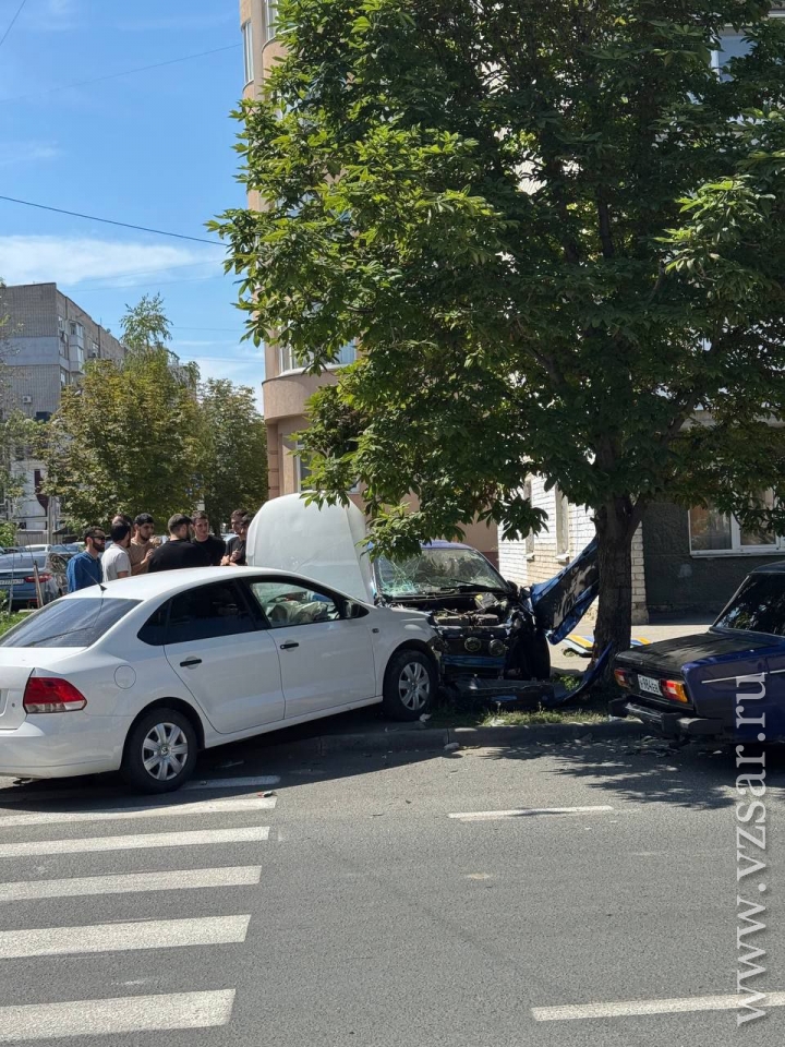Очевидцы рассказали ИА "Взгляд-инфо", что иномарка с госномерами Дагестана влетела в отечественное авто. В результате обе машины вылетели на тротуар, а "Лада" получила серьезные повреждения.