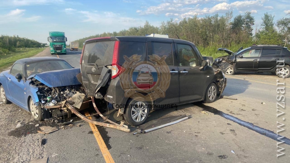 По предварительным данным, в 17.20 в Гагаринском районе, на 328-м километре трассы Сызрань – Саратов – Волгоград, столкнулись "Тойота" под управлением 38-летнего мужчины, "Субару" (он был в жесткой сцепке с "Гак") с 45-летним водителем, "Рено Сандеро" с 45-летней женщиной за рулем и "Фольксваген" под управлением 66-летнего пенсионера.