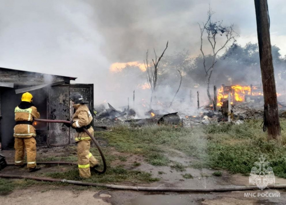 Предварительно, в 17.27 на пульт "01" поступил сигнал о возгорании по улице Фридриха Энгельса, 1, в поселке Пробуждение. Огонь охватил деревянные постройки (сараи) и два гаража.