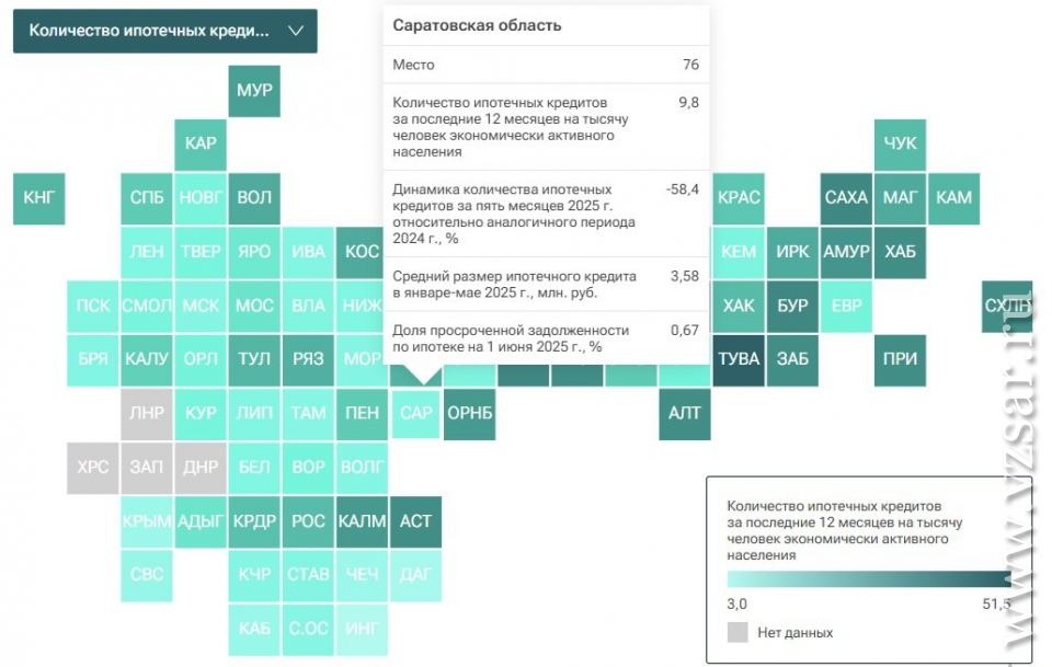 Год назад Саратовская область с показателем 20,2 занимала 71-ю строчку рейтинга (два года назад - 17,7 и 57-е место), а теперь она опустилась на 76-е с 9,8 ипотеки на тысячу населения.