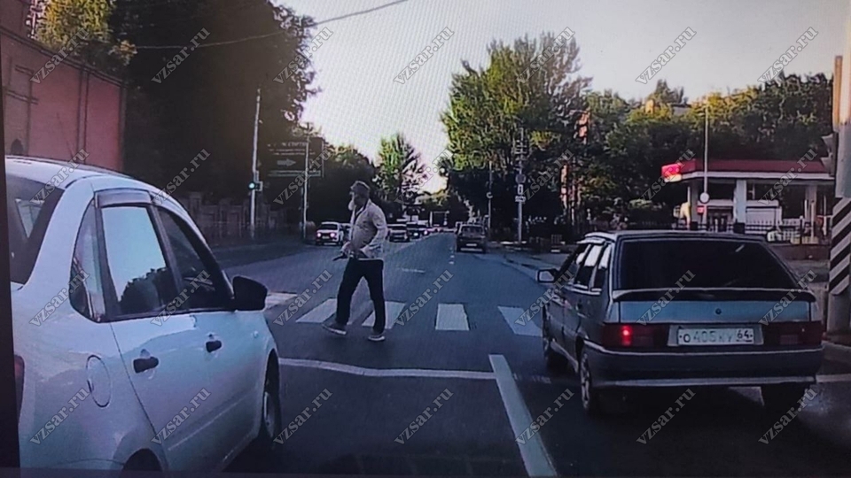На видео видно, как на перекрестке бородатый водитель белого автомобиля "Лада Гранта" с госномером М 877 РТ 164 с ножом побежал к водительской двери другой "Гранты" (госномер Т 743 ХМ 64), которая остановилась рядом на перекрестке у стоп-линии.