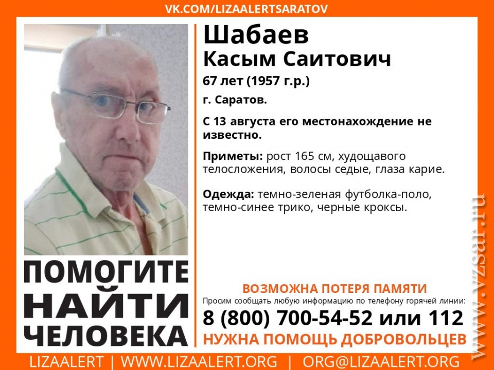 В Саратове ищут без вести пропавшего 67-летнего Касыма Шабаева. Об этом сообщает поисковый отряд "Лиза Алерт Саратов".