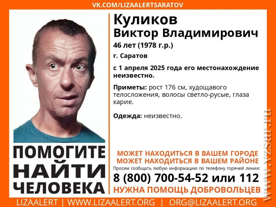 Так, в Саратове с 1 апреля ищут 46-летнего Виктора Куликова. Приметы пропавшего: рост 176 см, худощавого телосложения, волосы светло-русые, глаза карие. Во что был одет мужчина в день пропажи, неизвестно.