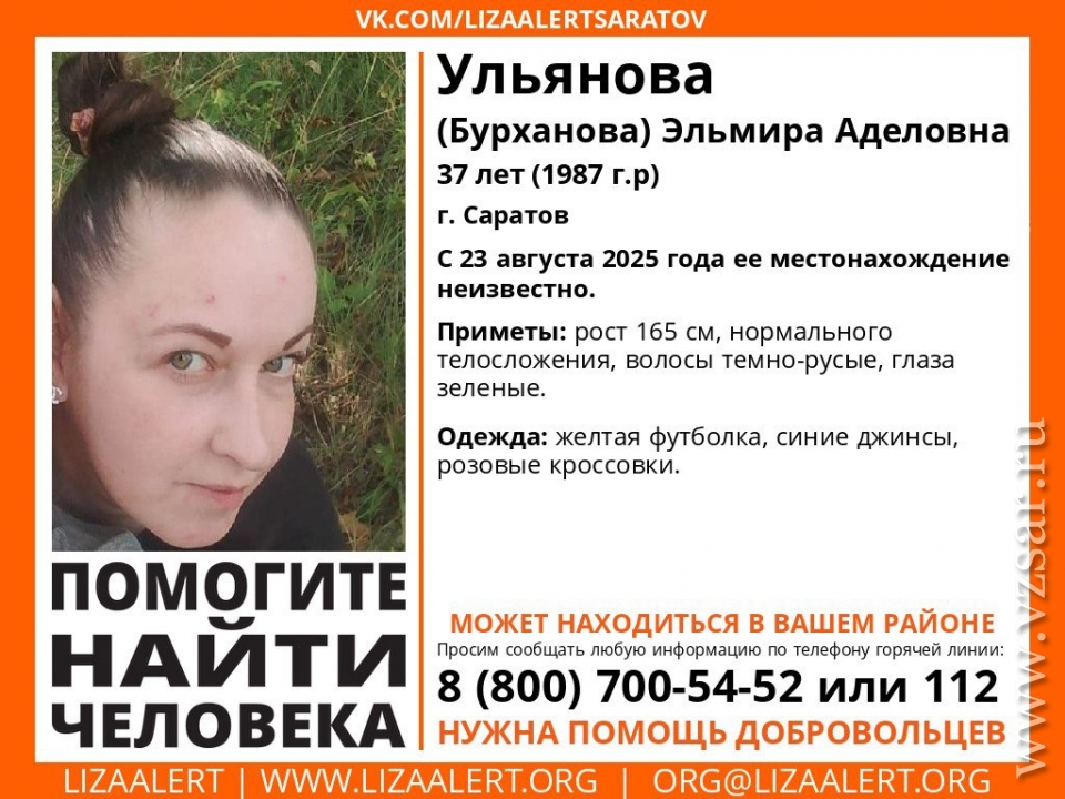 В Саратове ищут без вести пропавшую 37-летнюю Эльмиру Ульянову (Бурханову), сообщает поисковый отряд "Лиза Алерт Саратов".
