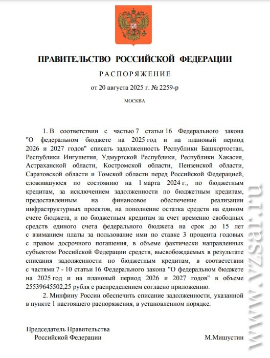 Согласно документу, Саратовской области спишут задолженность на сумму 7 млрд 546 млн 302 тысячи 613 рублей.