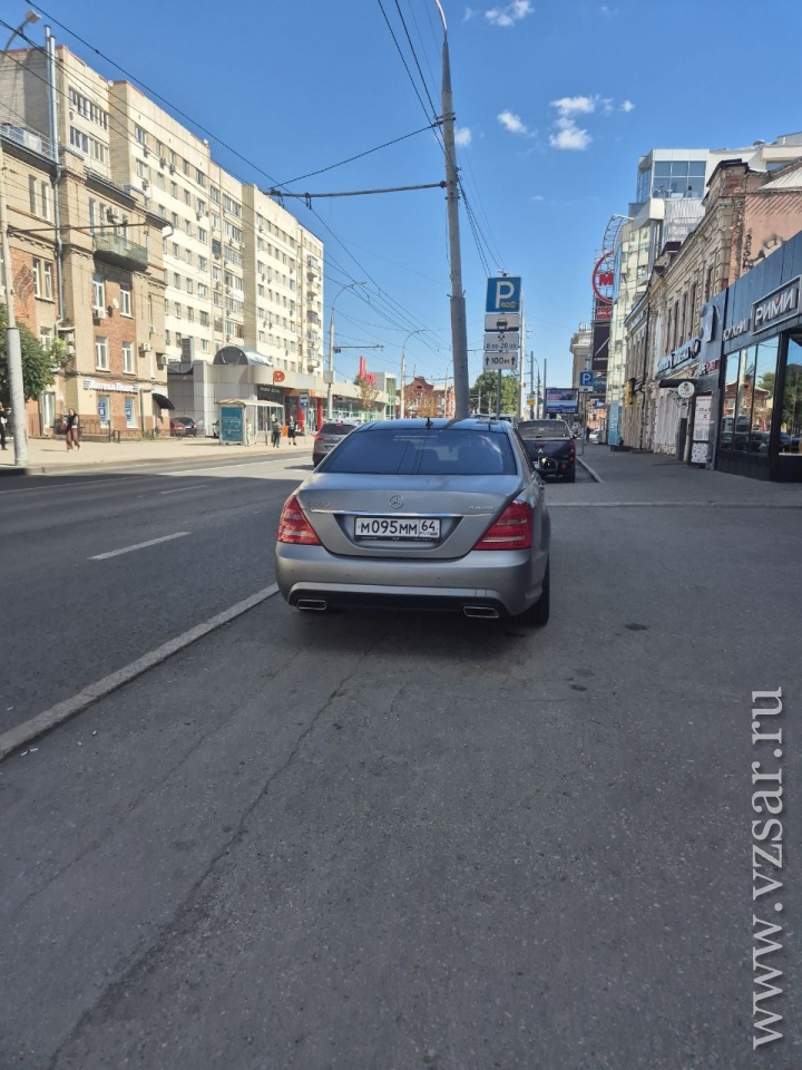 Нарушение было зафиксировано в 14.12 на улице Московская буквально в ста метрах от перекрестка с улицей Чапаева. Автомобиль Mercedes-Benz с госномером М 095 ММ 64 расположился на пешеходном тротуаре непосредственно перед началом зоны платной парковки.
