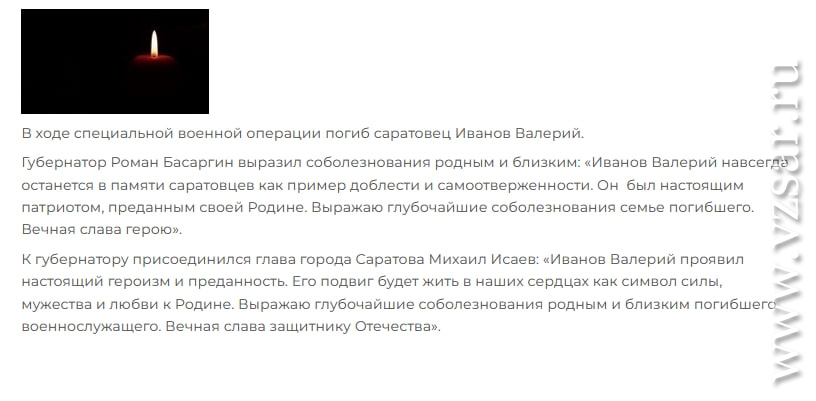 Администрация Саратова традиционно коротко сообщила о гибели Валерия Иванова.