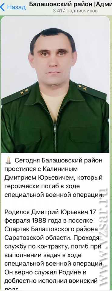 Администрация Балашовского района сообщает, что сегодня земляки простились с Дмитрием Калининым. Родился Дмитрий Юрьевич 17 февраля 1988 года в поселке Спартак Балашовского района. Проходя службу по контракту, погиб при выполнении задач.
