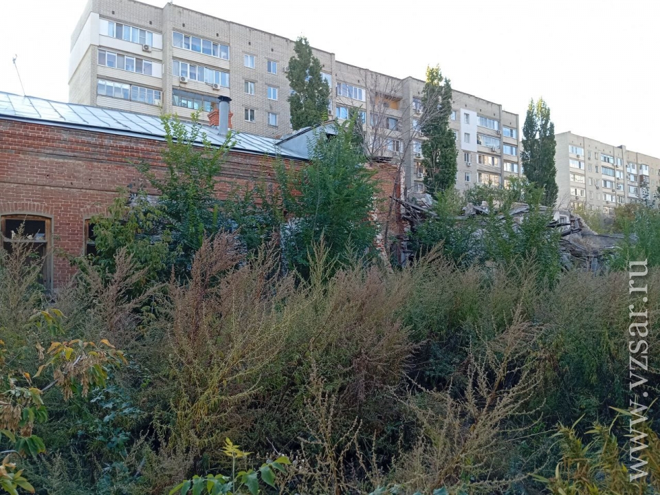 А за домом №57 каждый желающий может зайти на территорию опасности. В заборе из мятого профлиста отсутствует целая секция. Да что там забор – можно просто залезть в многочисленные выбитые окна. Внутри посетителей ждет уникальный саратовский бурьян, который наша мэрия старательно выращивает на каждом заброшенном объекте. Иной раз высота бурьяна достигает трех метров и выше.