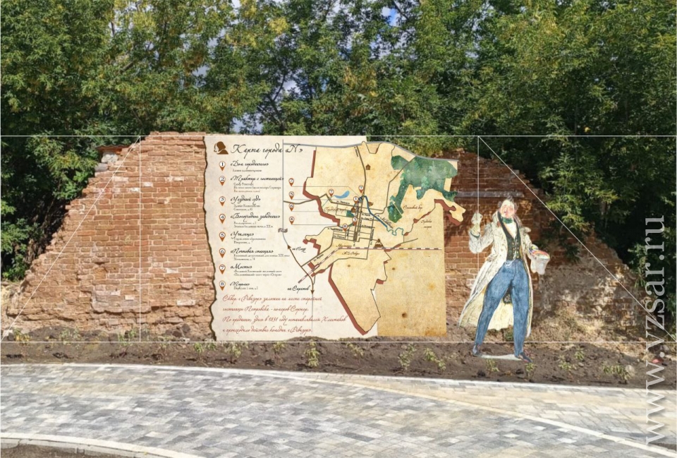 На другой стене разместится карта Петровска. На ней будут указаны исторические здания, где могло происходить действие "Ревизора" - дом городничего, трактир, богоугодные заведения, училище, уездный суд.