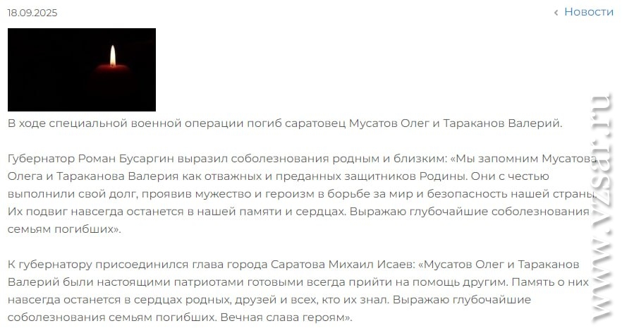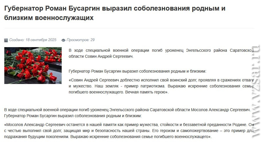Администрация Саратова без подробностей сообщила о гибели Олега Мусатова и Валерия Тараканова, а администрация Энгельсского района – о гибели Андрея Совина и Александра Мосолова.