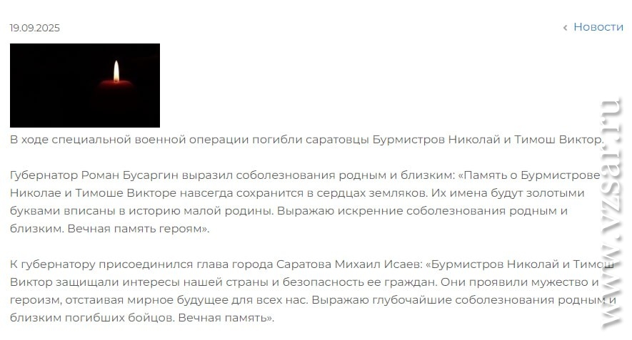 Администрация Саратова без подробностей сообщила о гибели Николая Бурмистрова и Виктора Тимоша, а администрация Энгельсского района – о гибели Андрея Совина.