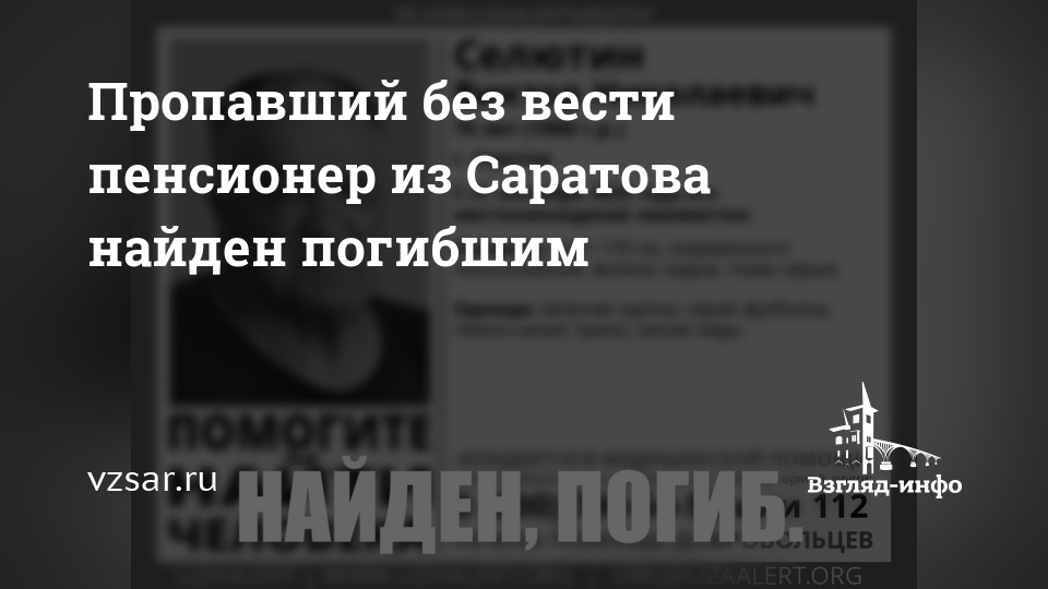 Пропавший вчера без вести в Саратове 75-летний Виктор Селютин погиб. Об этом сообщает поисковый отряд "Лиза Алерт Саратов".